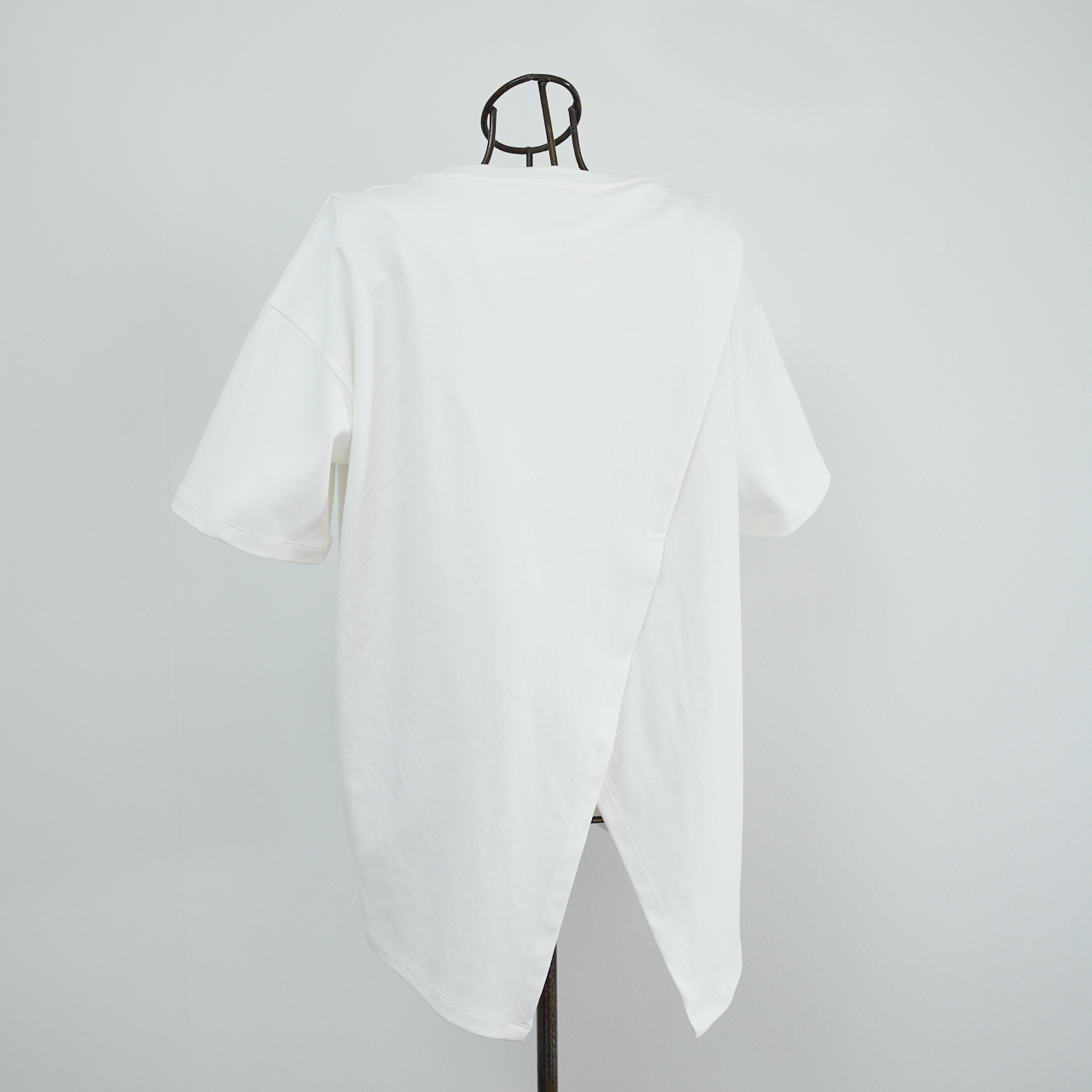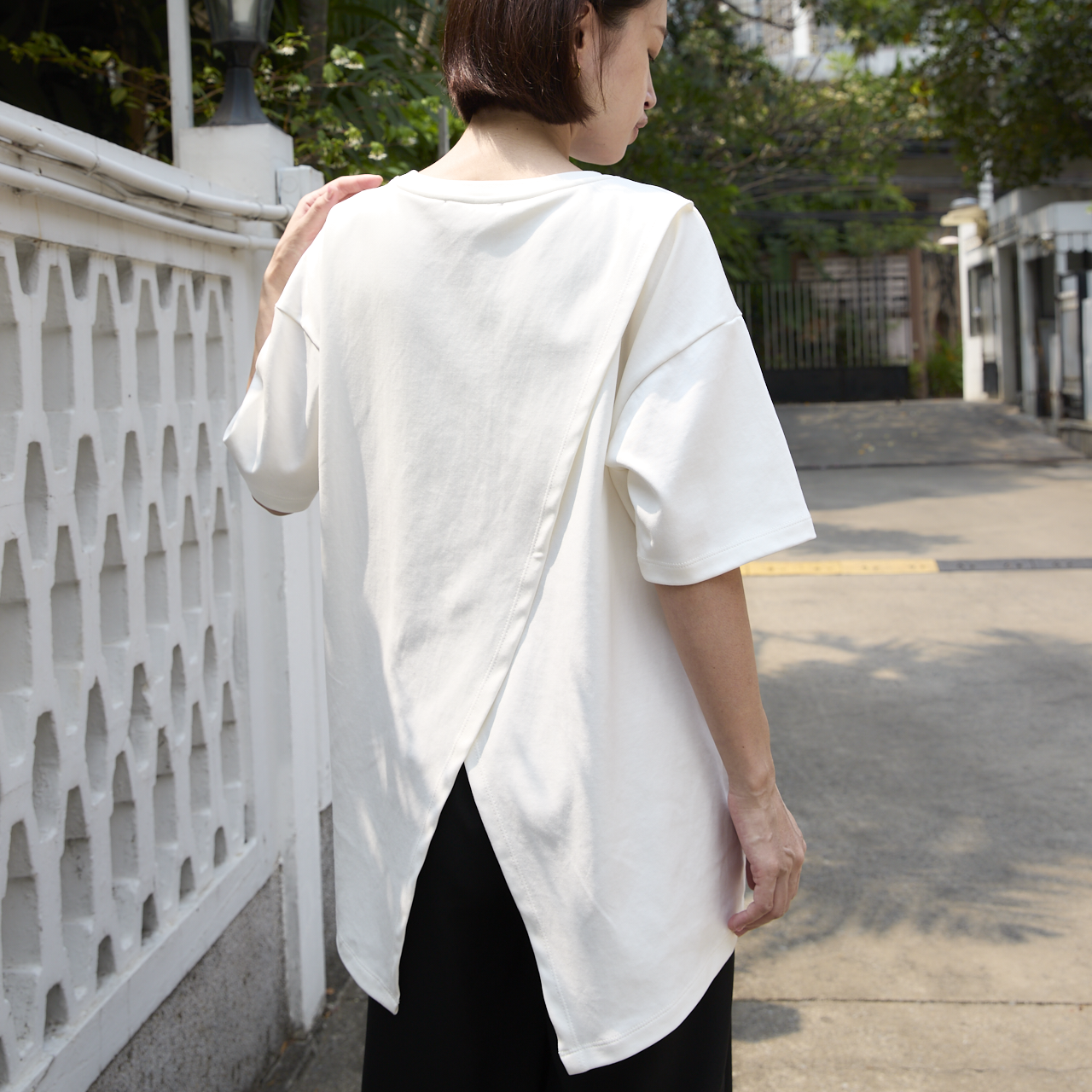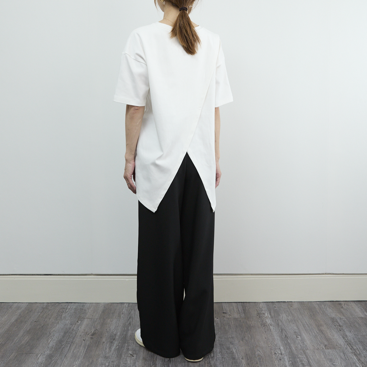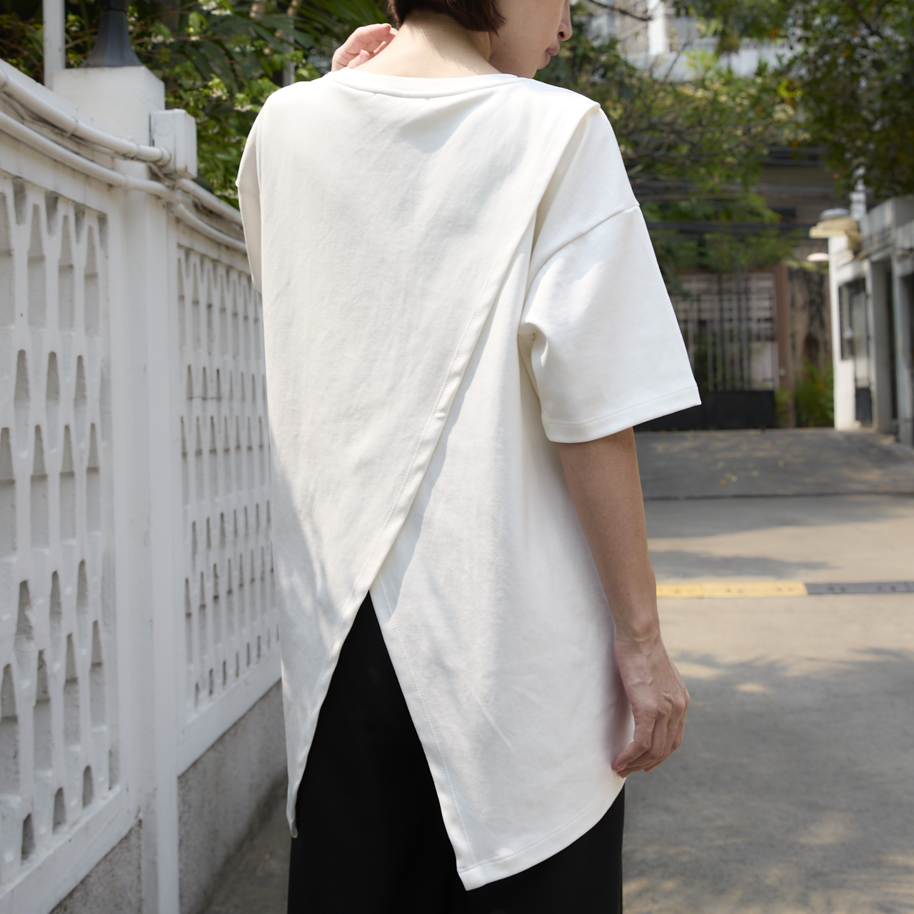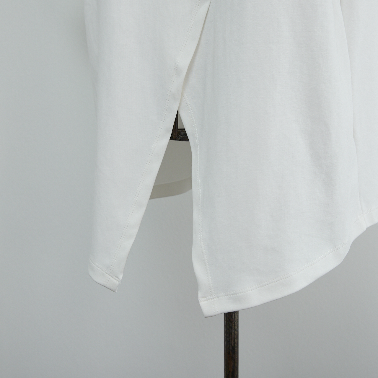 シルエットの動きを出すデザインのため、スリットのクロス部分は縫い付けられていません。素材はコットン95%、スパンデックス5%で伸縮性に優れています。