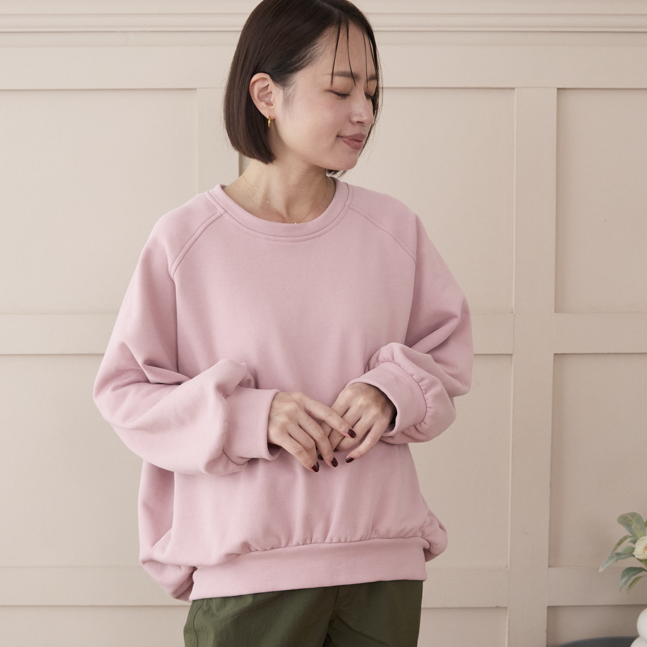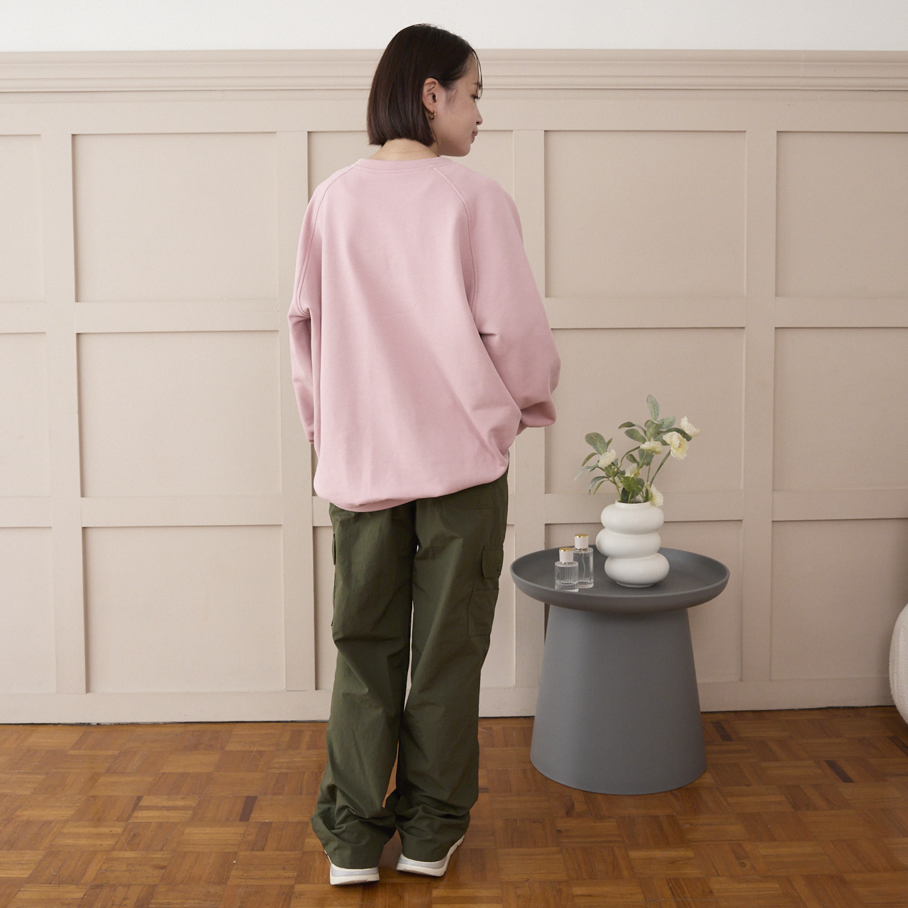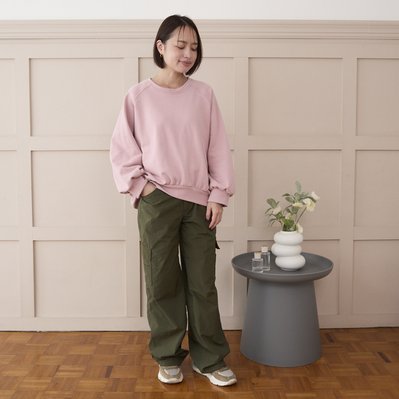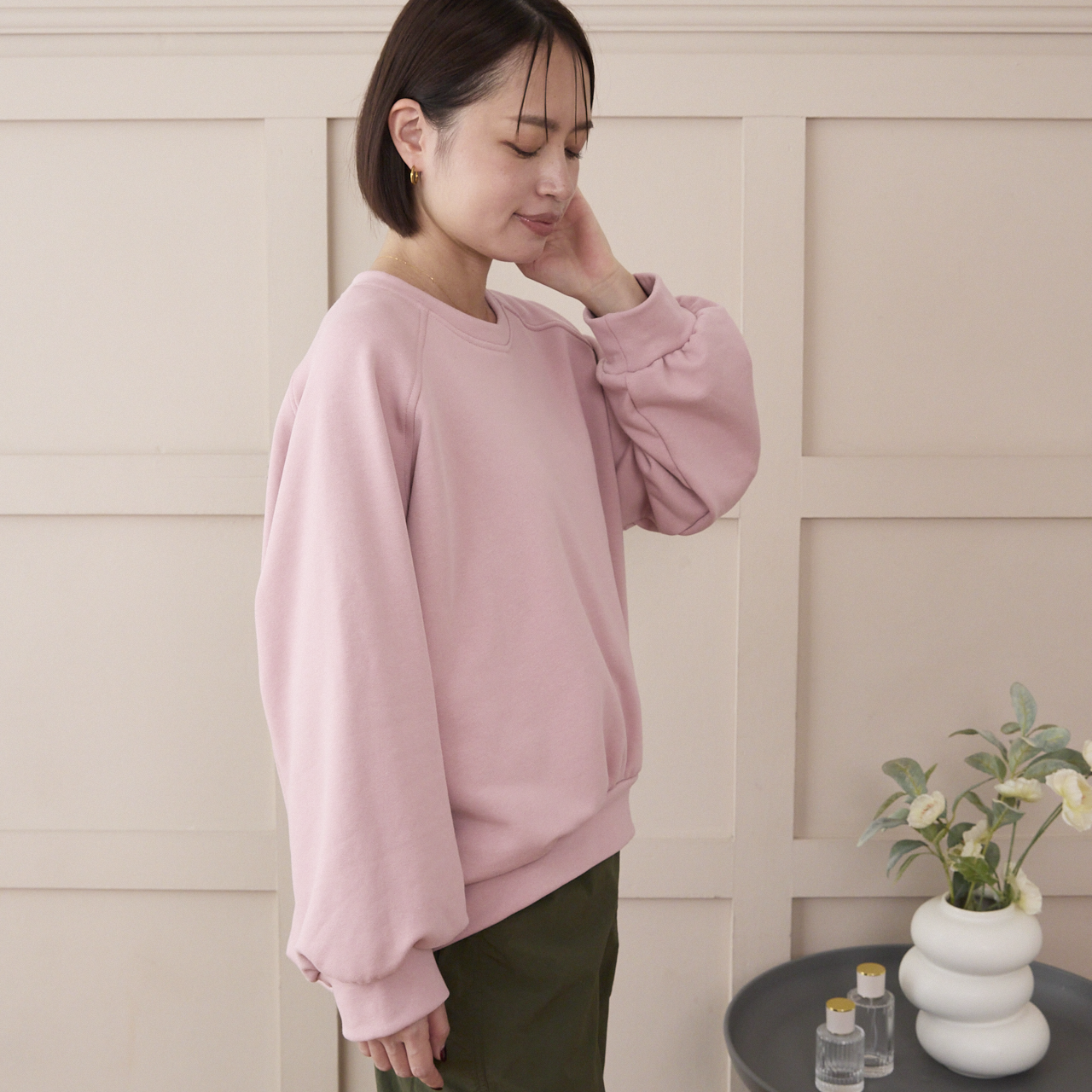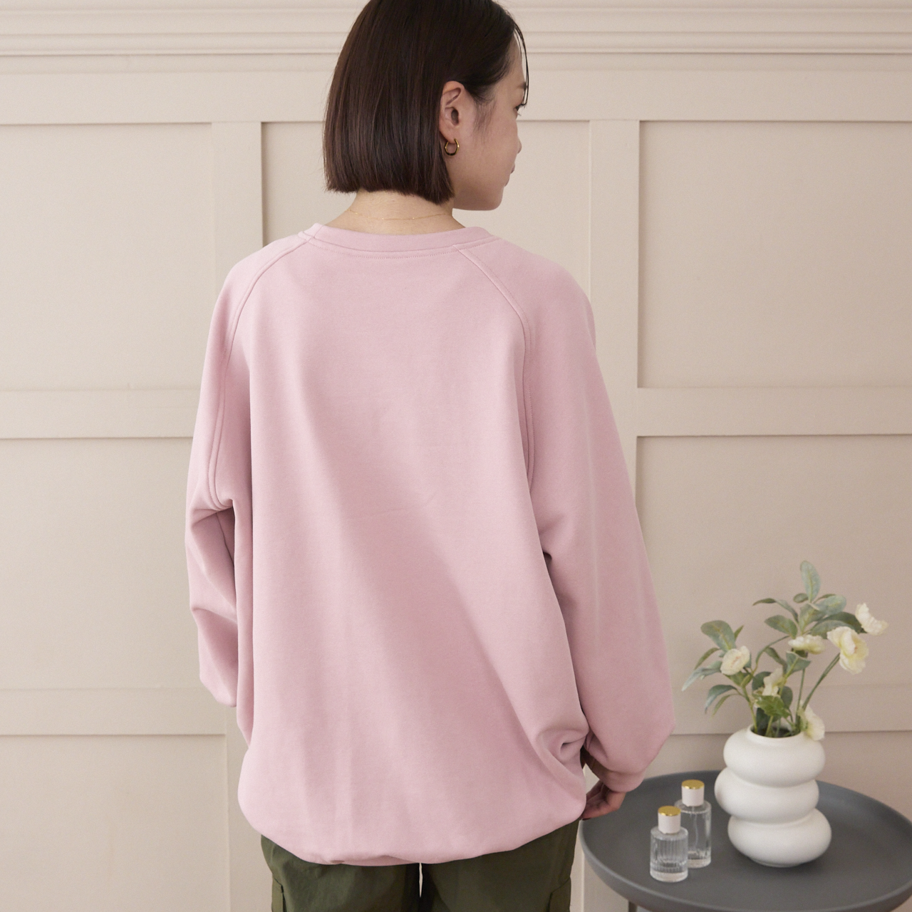 ゆったりしたオーバーサイズのトレーナーはリラックス感があり、大人スウェット。