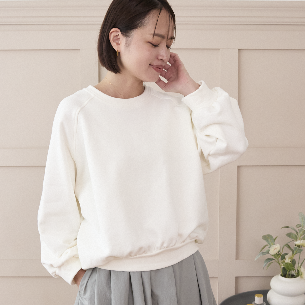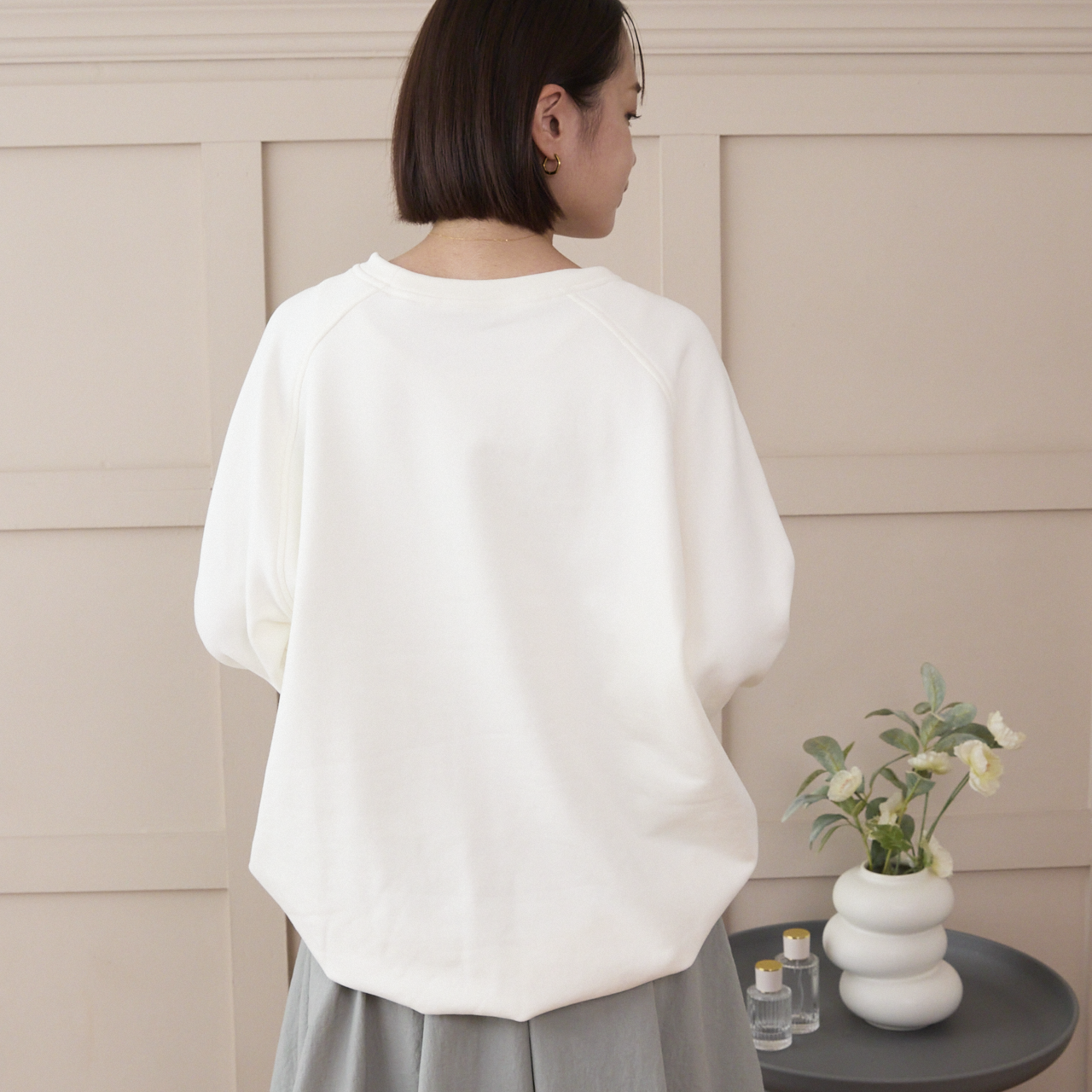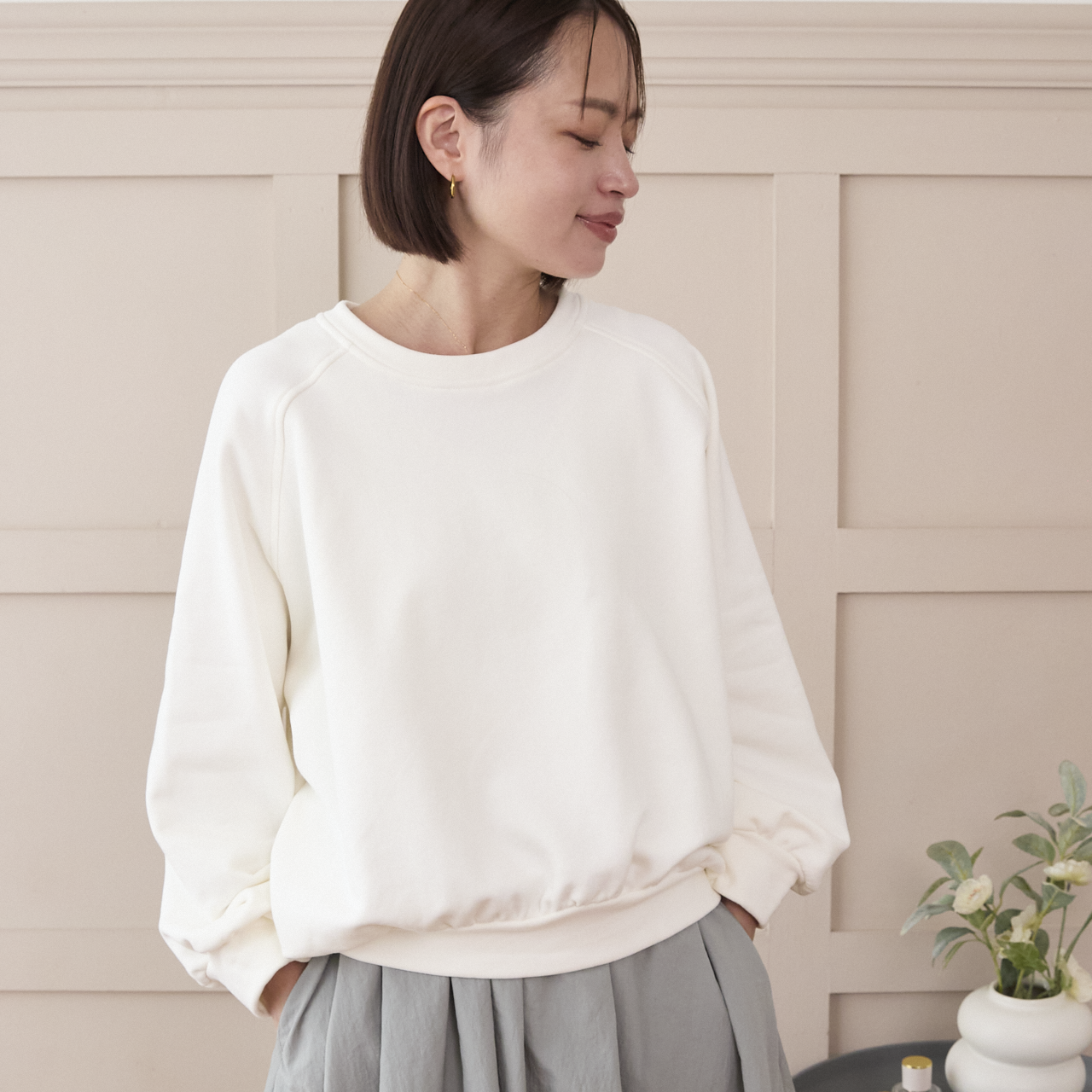 ゆったりしたオーバーサイズのトレーナーはリラックス感があり、大人スウェット。