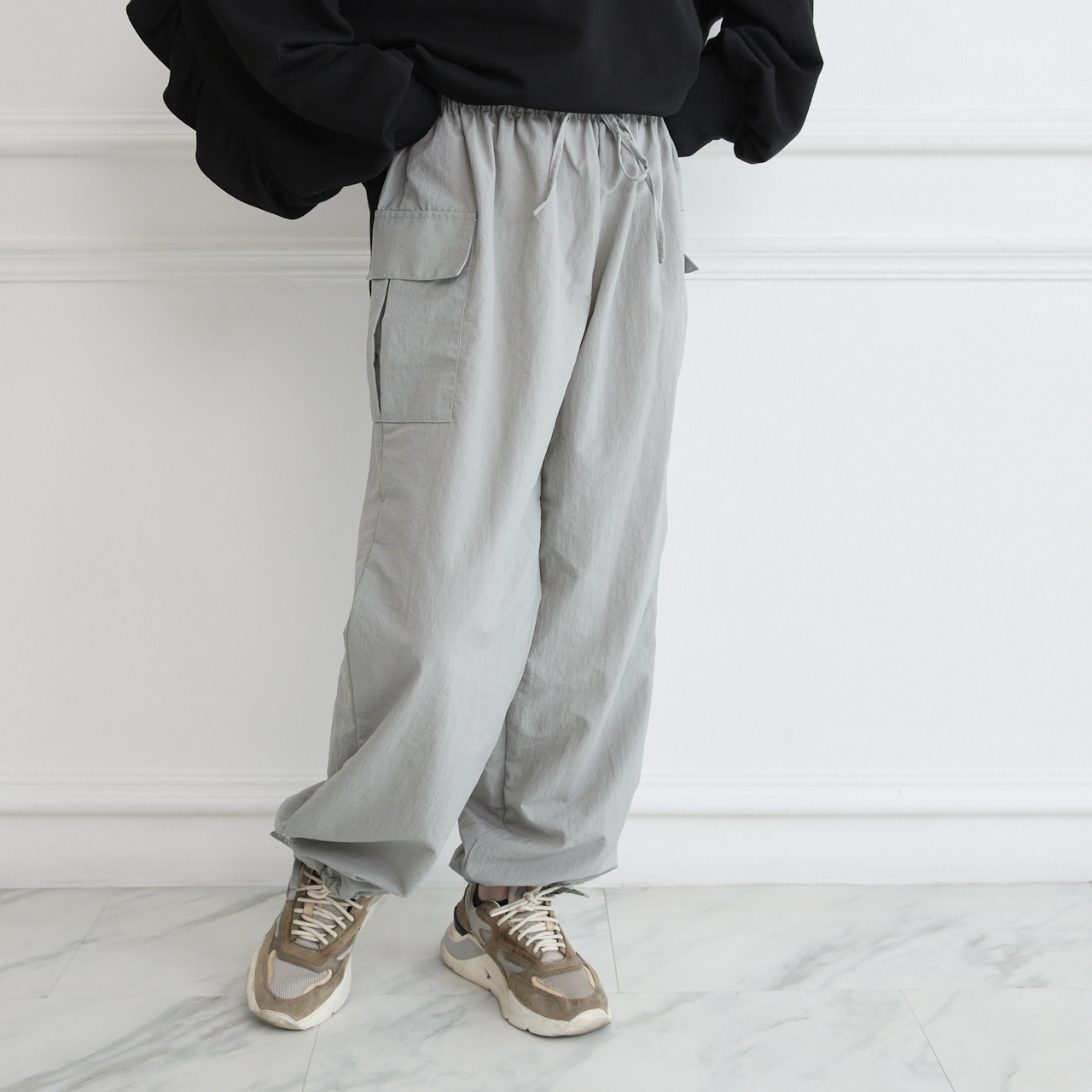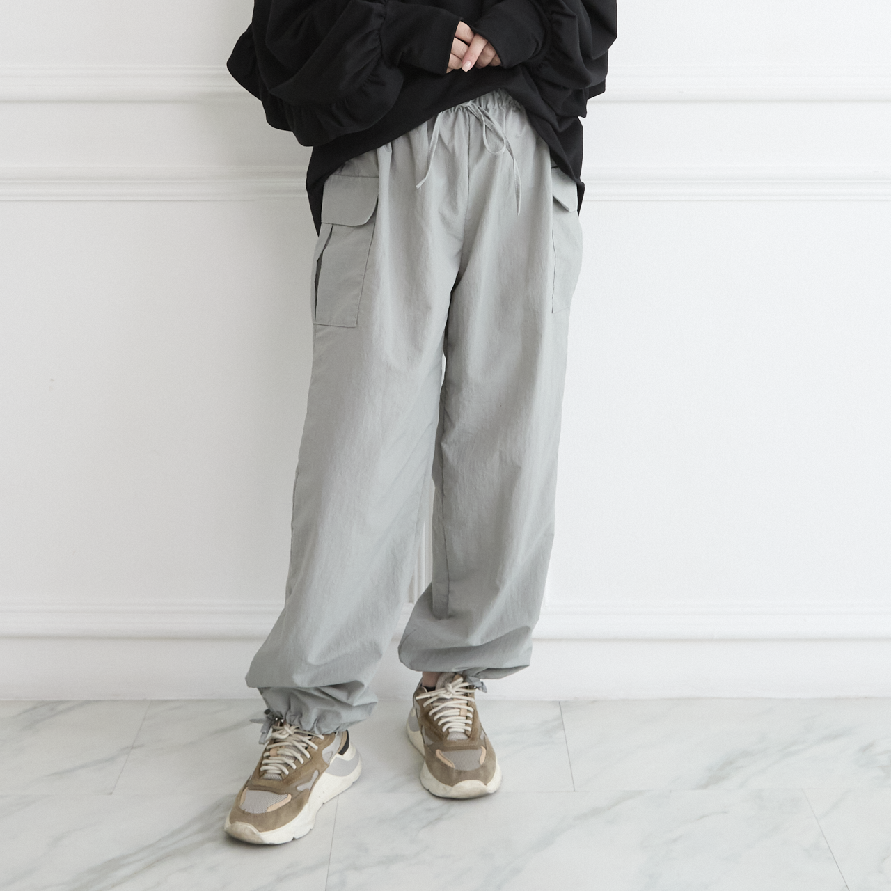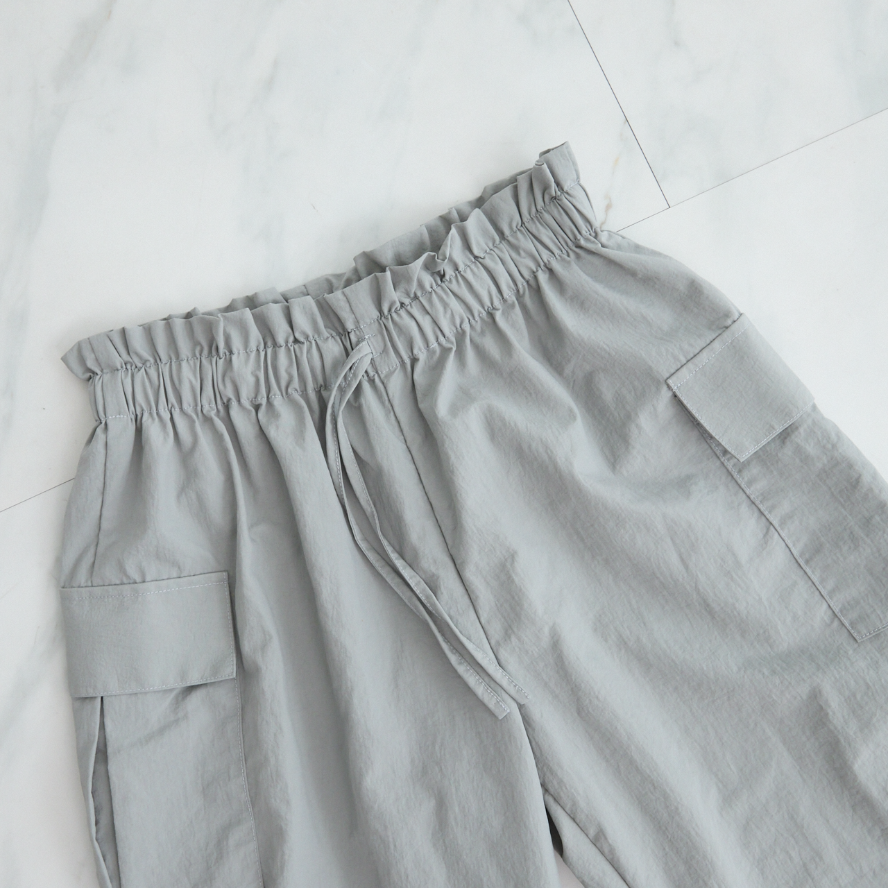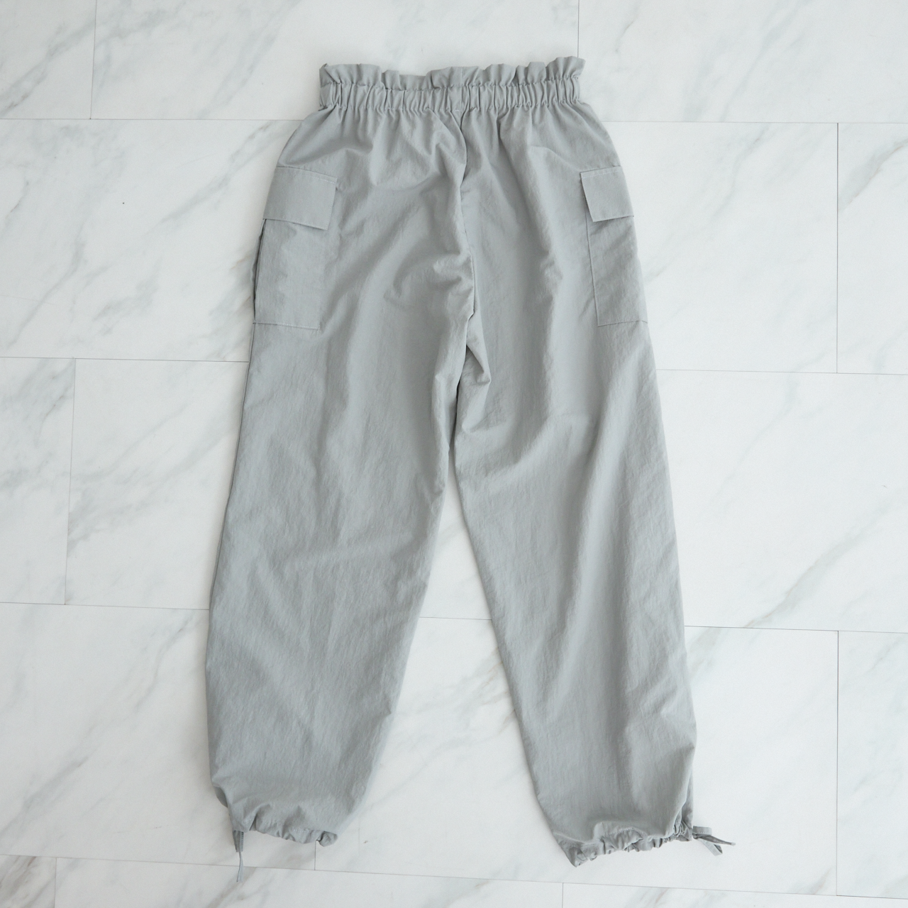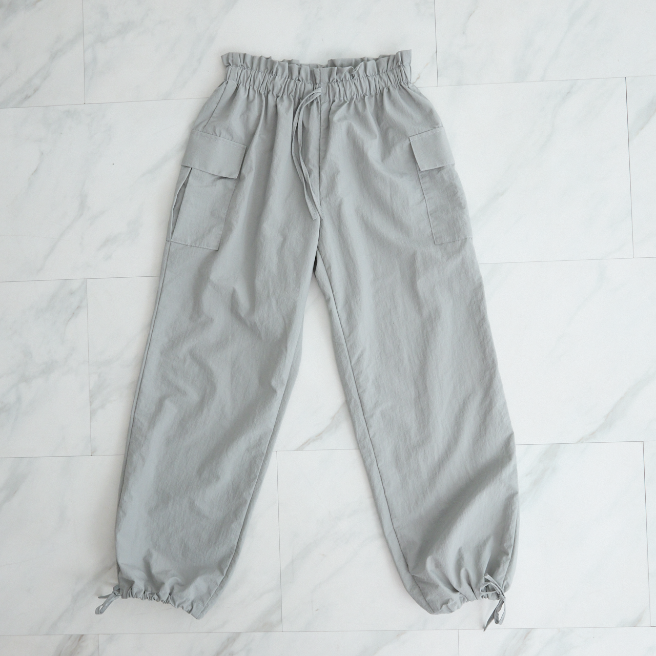ウエストはゴム仕様で穿きやすく、シルエットの微調整ができる裾紐を絞り。